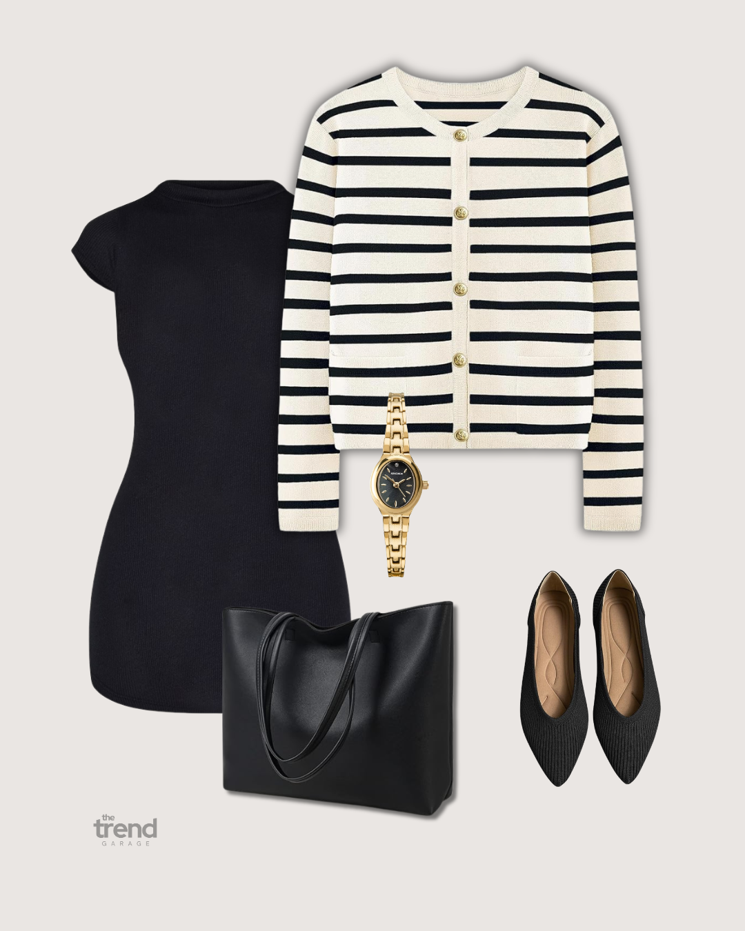 Black dress + striped cardigan + gold watch + flat shoes + black tote bag